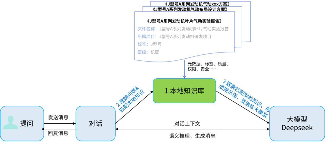 當用戶提出問題(如“J型號A系列發(fā)動機葉片的進氣參數設計值是多少”)時,系統首先需要理解問題的語義,并在本地知識庫中檢索相關的知識(如“J型號A系列發(fā)動機”“葉片”“進氣參數”“設計值”等關鍵詞)。