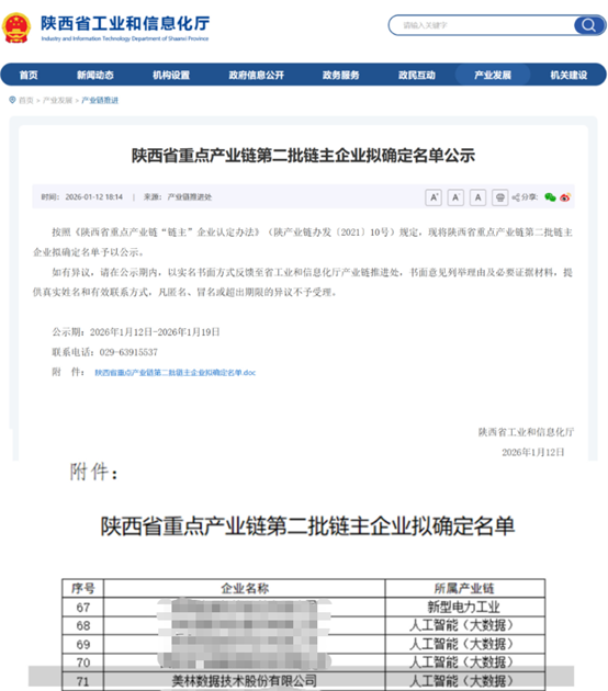 近期,陜西省工業(yè)和信息化廳按照《陜西省重點產(chǎn)業(yè)鏈“鏈主”企業(yè)認定辦法》(陜產(chǎn)業(yè)鏈辦發(fā)〔2021〕10號)規(guī)定,公示新一批陜西省重點產(chǎn)業(yè)鏈鏈主企業(yè)擬確定名單,美林數(shù)據(jù)技術(shù)股份有限公司入人工智能(大數(shù)據(jù))產(chǎn)業(yè)鏈鏈主企業(yè)。