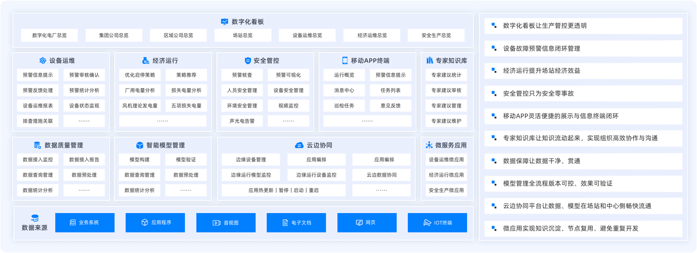 以“安全高效生產(chǎn)”為核心,以數(shù)字化為手段,穿透新能源電廠生產(chǎn)數(shù)據(jù),透視“人、機、料、法、環(huán)”與生產(chǎn)業(yè)務(wù)關(guān)系,實現(xiàn)設(shè)備高效運維、降低運營成本、強化安全風險管控,提高企業(yè)在電力市場中的競爭力。該方案已在多家電力龍頭企業(yè)落地應(yīng)用,總計接入風電機組4萬余臺,光伏場站500余個,總裝機容量超過150GW。