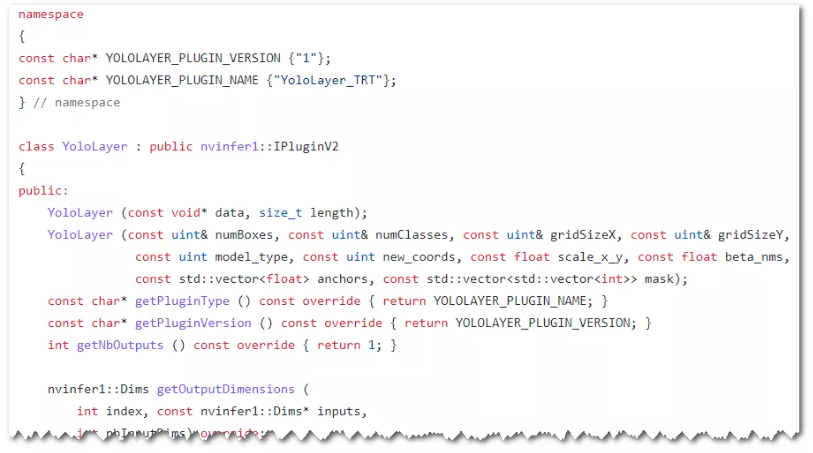 由于第一階段采用的檢測模型為Yolov4-tiny,而TensorRT中對其中的一些層的算子不支持,要生成優(yōu)化模型,需要結(jié)合DeepStream部署框架及TensorRT相關(guān)標(biāo)準(zhǔn),實(shí)現(xiàn)對應(yīng)IPluginV2和IPluginCreator的接口: