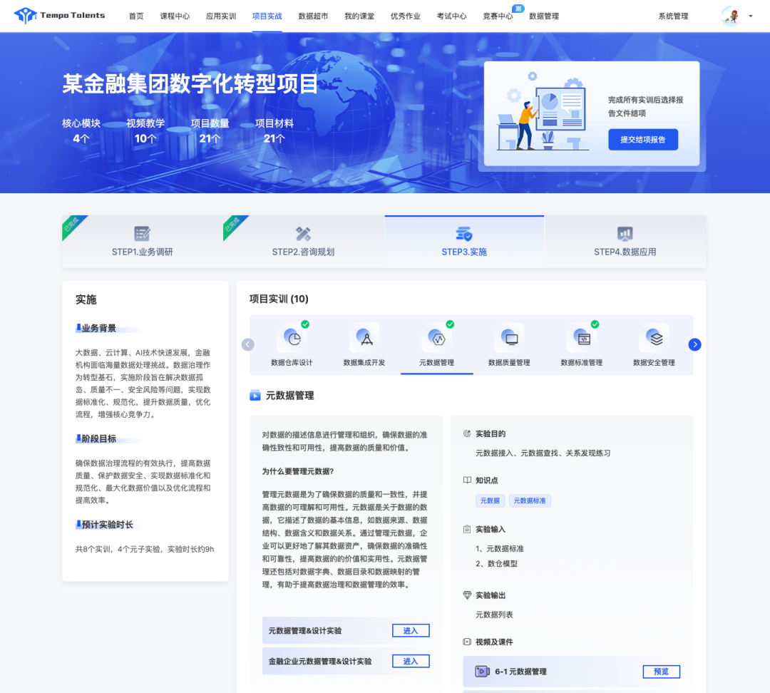在實(shí)訓(xùn)平臺中,我們創(chuàng)新性地引入了“數(shù)據(jù)治理項(xiàng)目應(yīng)用實(shí)戰(zhàn)”模塊,該模塊緊密依托產(chǎn)業(yè)側(cè)在數(shù)字化轉(zhuǎn)型落地過程中的真實(shí)數(shù)據(jù)治理項(xiàng)目,通過場景的精細(xì)拆解與高度還原,巧妙融合教學(xué)規(guī)律,從知識、技能與方法論三個(gè)維度,系統(tǒng)性地培養(yǎng)學(xué)生的數(shù)據(jù)治理綜合實(shí)戰(zhàn)能力: