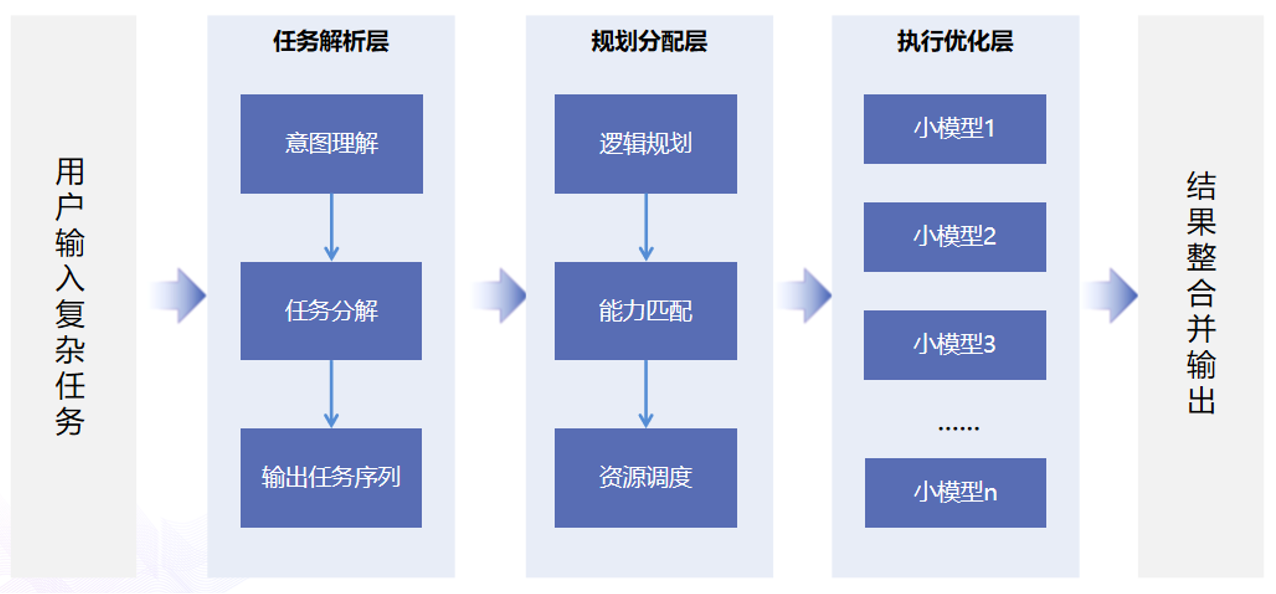 大模型在任務(wù)解析層負責接收用戶指令并理解用戶復雜需求,然后在規(guī)劃分配層將一個復雜的任務(wù)分解成多個較為簡單的小任務(wù),并進行執(zhí)行順序的邏輯規(guī)劃;小模型則在執(zhí)行層專注處理細分任務(wù),發(fā)揮其專業(yè)精度和高效執(zhí)行的優(yōu)勢。