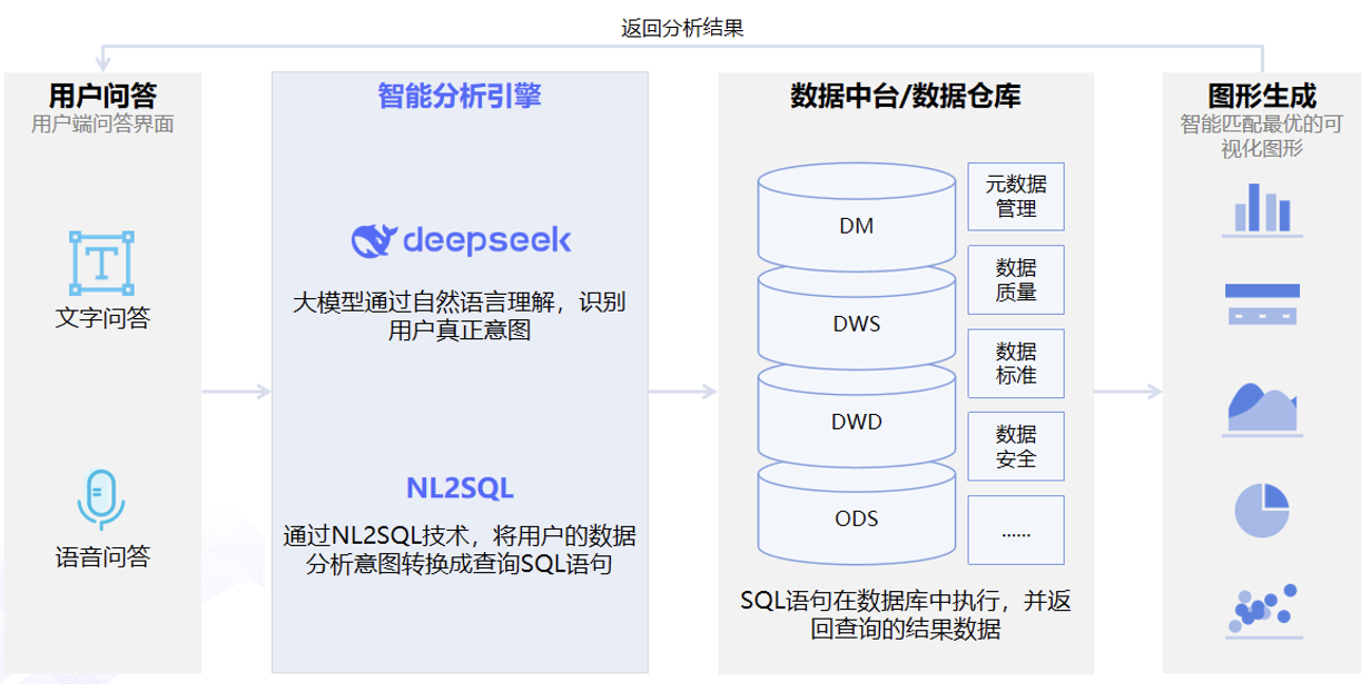 深度整合企業(yè)數(shù)據(jù)中臺/數(shù)倉中的中間表、結(jié)果表等核心數(shù)據(jù)資產(chǎn),構(gòu)建覆蓋全業(yè)務(wù)鏈條的數(shù)據(jù)問答體系。大模型通過自然語言理解技術(shù),精準解析用戶復雜查詢意圖,將語義指令轉(zhuǎn)化為高效查詢語句。在數(shù)據(jù)執(zhí)行層,結(jié)合元數(shù)據(jù)管理模塊自動匹配字段映射關(guān)系,同時通過數(shù)據(jù)質(zhì)量校驗機制確保查詢結(jié)果的準確性。